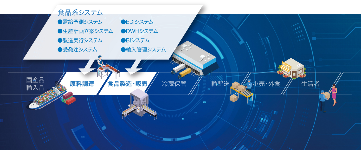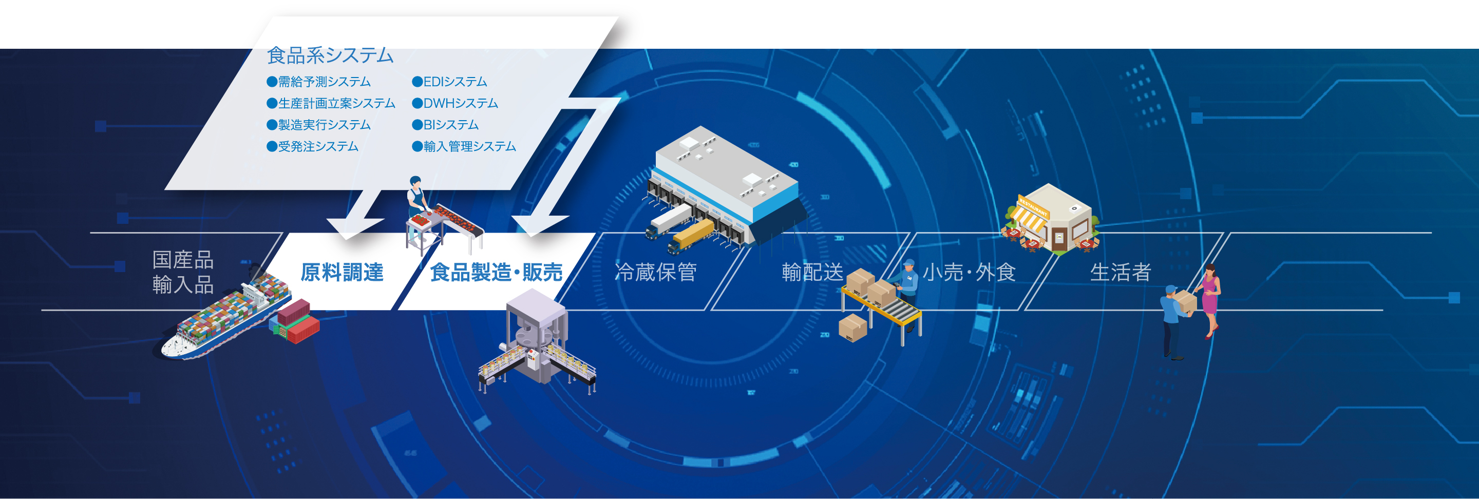 食品メーカーは、ナショナルブランドやプライベートブランドなど多彩な商品をスーパーや外食産業・給食産業に供給しています。多品種化した商品アイテムの需要を予測し、生産計画や販売活動を行って顧客に商品を届けるためには食品システムが欠かせません。これまで私たちが培ってきた食品業界ノウハウに、最新の日立IT/DXの技術をかけ合わせた食品システムで、食品業界全体を進化させ、日本の「食」を支えてまいります。