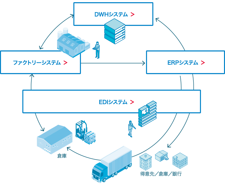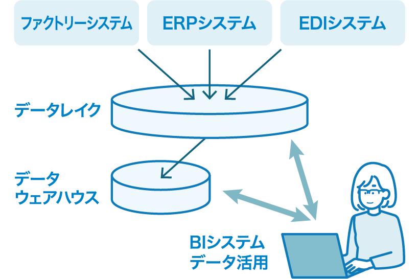 ファクトリーシステム、ERPシステム、EDIシステム全てのシステムで得られたデータは、データレイク、データウェアハウスに蓄積され、BIシステムなどを用いて活用します。