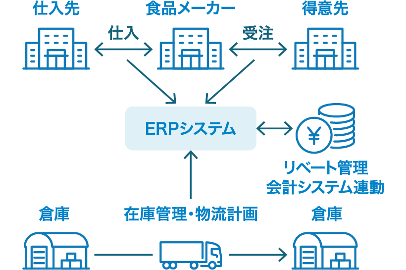 食品メーカーが事業を行うために欠かせない、さまざまな取引の記録「SoR(System of Record)」を行い管理します。